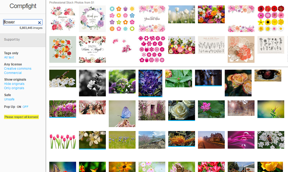 I don't know about you, but I'm a huge fan of Flickr. I'm no photographer but with the immense number of images on the site, you can spend hours browsing for inspiration. Compfight is a service that allows you to quickly search Flickr and browse hundreds of results instantaneously. There's also an option to search only the Creative Commons images, saving you a couple clicks compared to Flickr's own “Advanced Search.” One other thing that makes Compfight useful is the fact that when you roll over each thumbnail, it tells you the pixel dimensions of the ‘original' size image.